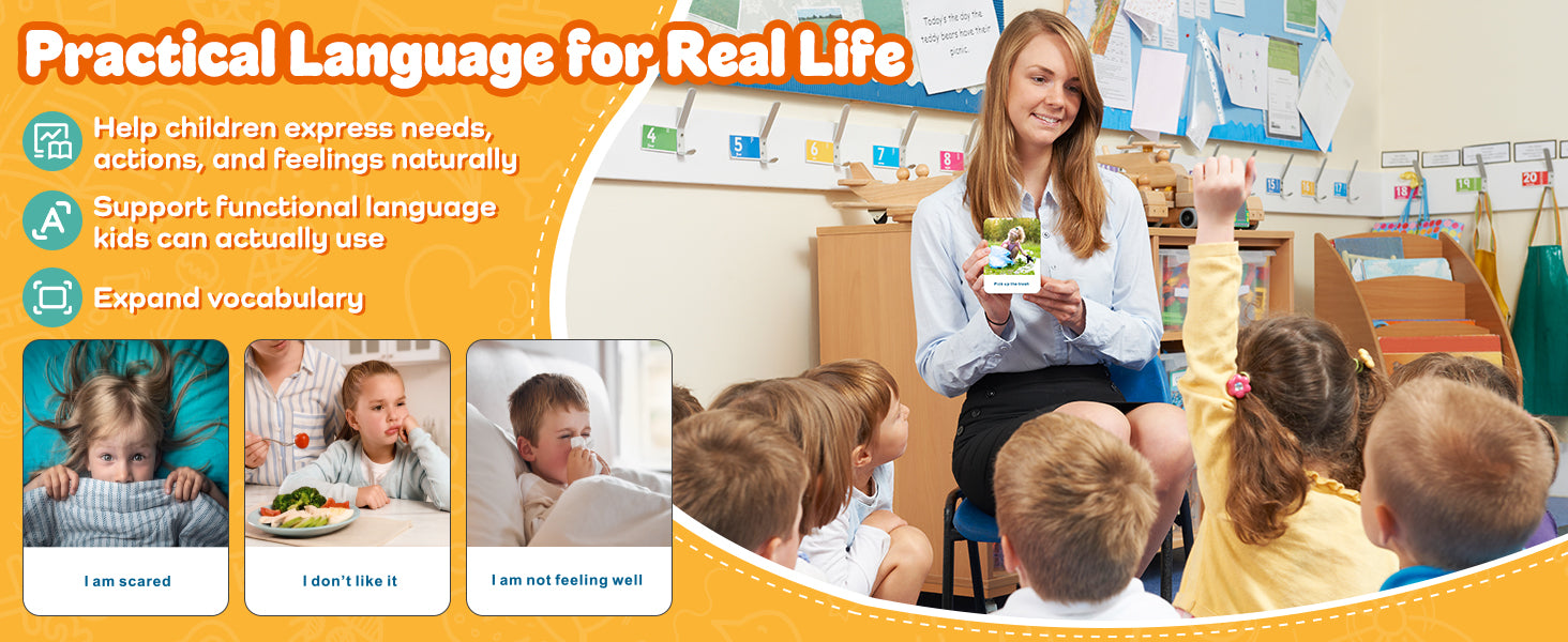 Simple phrases in most cardsβnot single wordsβsupport natural language and real conversations.